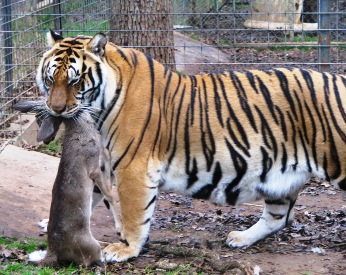 A group of captive bred and raised tigers were confiscated and kept by the government agency as evidence for a case going to trial. There were supposedly 5-6 tigers in a multi-acre pen that had NEVER been messed with, and they had no way to separate them. They would use a tractor and a front end loader to dump deer carcasses over the top of the fence to feed the cats.