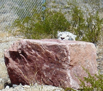This captive pet white tiger is not used to strangers and often hides from them.
